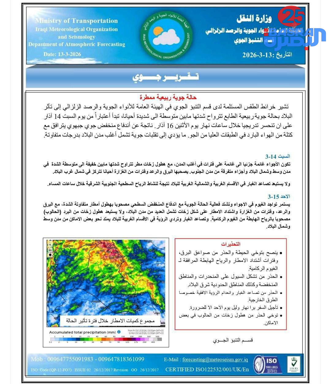 5 قد تعجبك أيضاً المستشار مكاوي يعزي الرئيس البيض بوفاة شقيقه ابوبكر المحسوسة 1… بغداد تتفوق على روما الآن في أنخفاض درجات الحرارة- شلونها الاجواء يمكم؟ راصد جوي : منخفض قطبي يؤثر على العراق والحرارة دون الصفر المئوي 🟠️ الأنواء الجوية: هطول أمطار ابتداءً من يوم غد الأربعاء إلى يوم الإثنين المقبل شاركها 0 FacebookTwitterPinterestLinkedinWhatsappTelegramCopy Link cps المقالة السابقة انف…جار آخر يهز بغداد الان المقالة التالية استه…داف مقر اللو..اء الثلاثين لقو..ات الح.ش.د الش.عب.ي في منطقة سهل نينوى من قبل طائرات مقا…تلة معادية قد تعجبك أيضاً 🟠️ الأنواء الجوية: هطول أمطار ابتداءً من يوم غد الأربعاء إلى يوم... 2026-03-10 راصد جوي : منخفض قطبي يؤثر على العراق والحرارة دون الصفر المئوي 2026-02-26 مرصد العراق الأخضر: الصيف المقبل سيكون أكثر سخونة وحرارة من الصيف الذي... 2026-02-20 المنخفض الجوي يقتحم الٱن أجواء غرب وشمال شرق ووسط والفرات الأوسط من... 2026-01-09 فرص هطول ثلوج في بعض المناطق الوسطى مع منخفض قطبي شديد البرودة..... 2025-12-31 المحسوسة 1… بغداد تتفوق على روما الآن في أنخفاض درجات الحرارة- شلونها... 2025-12-31 اترك تعليقًا إلغاء الرد احفظ اسمي، البريد الإلكتروني، والموقع الإلكتروني في هذا المتصفح للمرة القادمة التي سأعلق فيها.