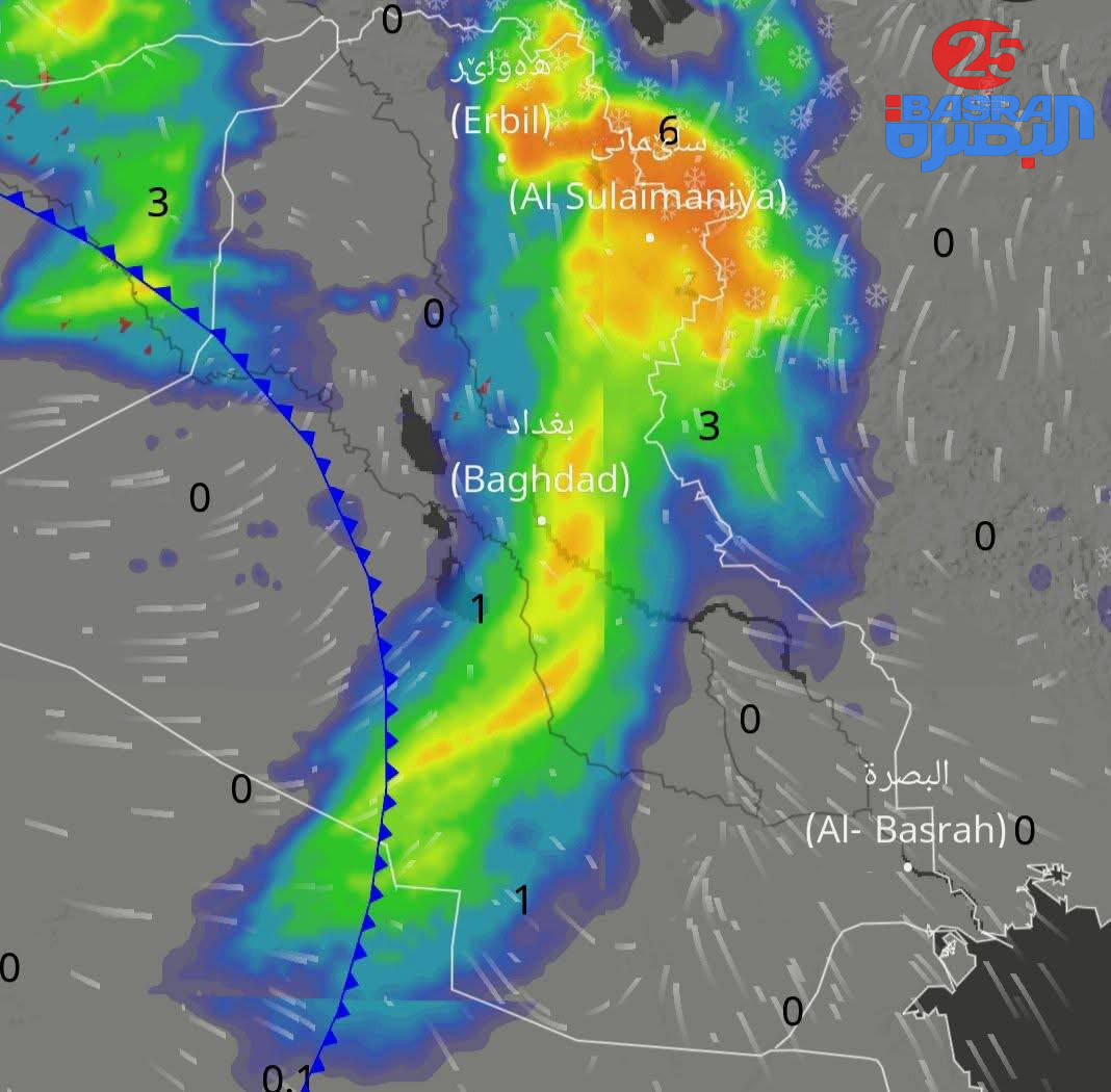 - فرص هطول ثلوج في بعض المناطق الوسطى مع منخفض قطبي شديد البرودة.. الانواء الجوية: تشير التوقعات إلى تأثر العراق بمنخفض قطبي يسبب أمطاراً وثلوجاً شمالاً، مع تساقط متقطع على المرتفعات. 🔻 الانواء الجوية: كما يُتوقع امتداد الأمطار إلى المنطقة الوسطى مع احتمال ضعيف للثلوج، فيما تبقى فرص التأثر في الجنوب محدودة.