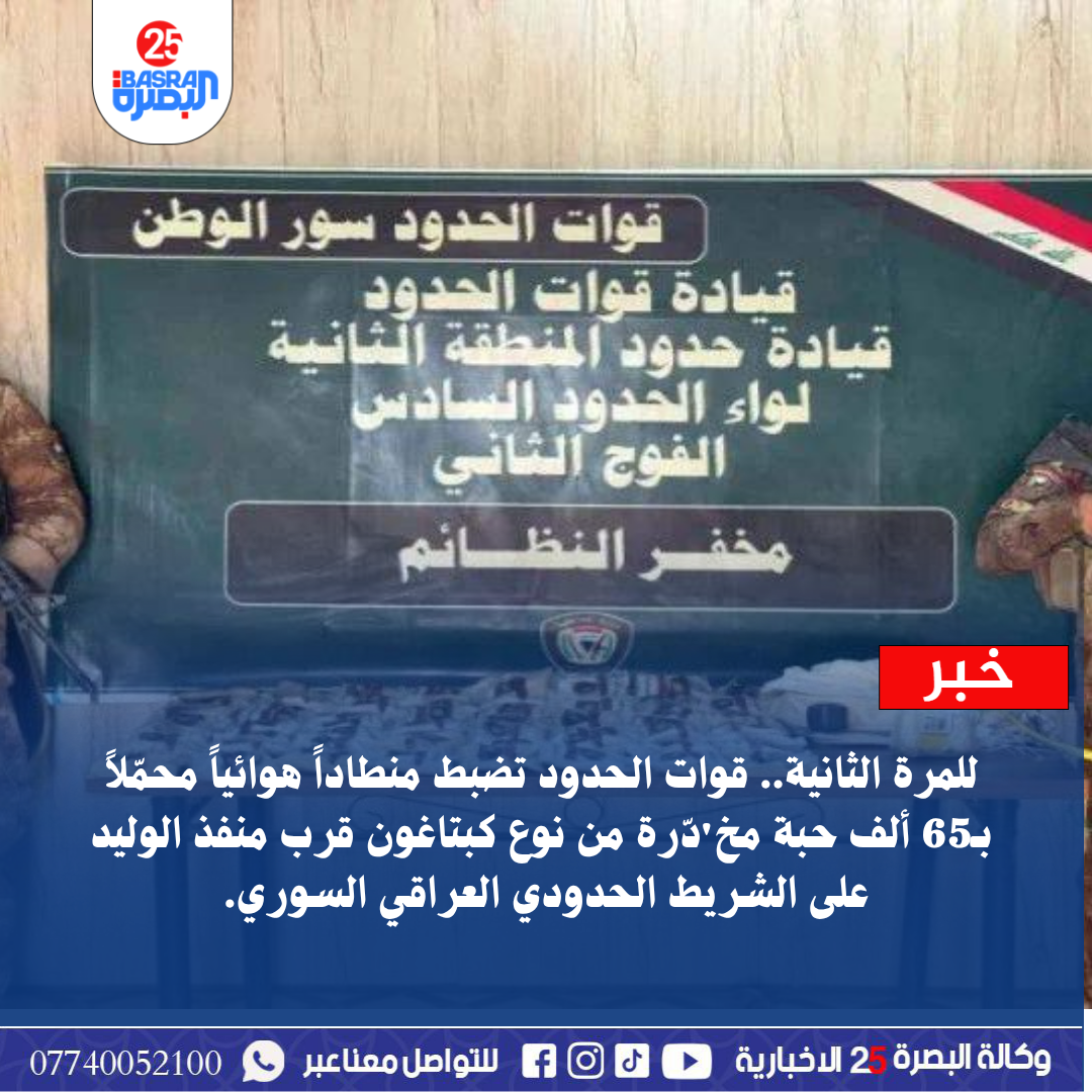 للمرة الثانية.. قوات الحدود تضبط منطاداً هوائياً محمّلاً بـ65 ألف حبة مخدّرة من نوع كبتاغون قرب منفذ الوليد على الشريط الحدودي العراقي السوري.
