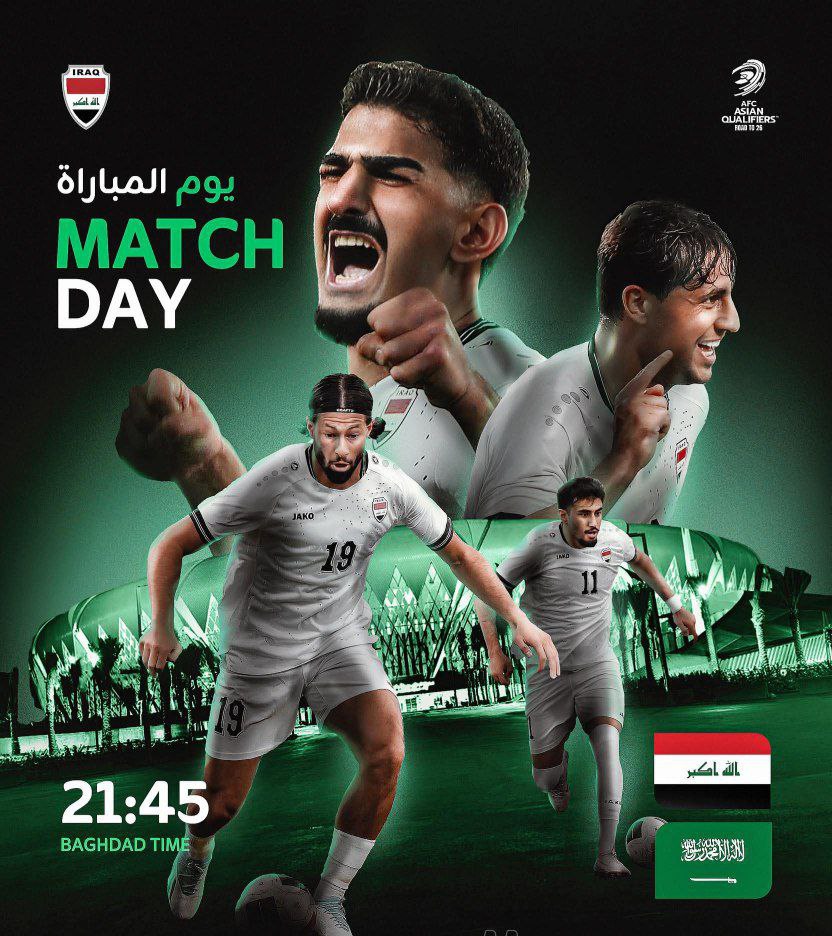مباراة الحلم للعراقيين، وتحت شعار “يا أسود أنتم گدها وگدود”… يخوض منتخبنا الوطني مواجهة نارية أمام نظيره السعودي عند الساعة 9:45 مساءً اليوم الثلاثاء على أرض ملعب «الجوهرة المشعة» في مدينة جدة السعودية، ضمن الجولة الثالثة من الملحق الآسيوي المؤهل إلى كأس العالم 2026