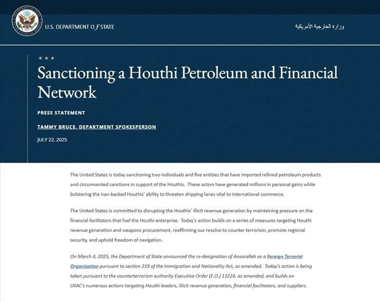 وأكدت الخارجية الأميركية أن هذا الإجراء يأتي ضمن استراتيجية مستمرة لعرقلة مصادر الإيرادات غير المشروعة للحوثيين، وتضييق الخناق على مزوديهم الماليين وشبكات الدعم، في إطار جهود واشنطن لمكافحة الإرهاب وتعزيز الأمن الإقليمي وضمان حرية الملاحة.