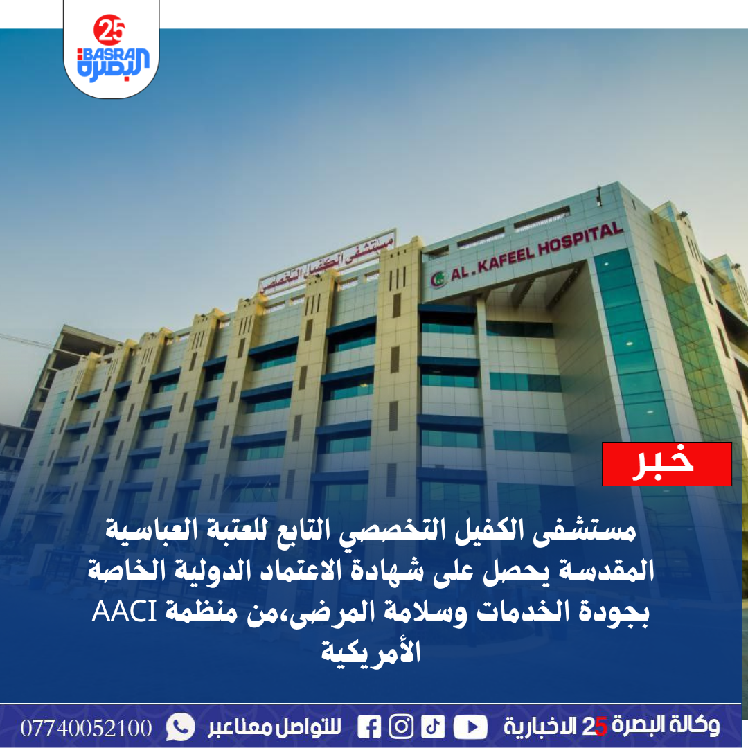 الصفحة الرئيسية . أخبار العراقمستشفى الكفيل التخصصي التابع للعتبة العباسية المقدسة يحصل على شهادة الاعتماد الدولية الخاصة بجودة الخدمات وسلامة المرضى،من منظمة AACI الأمريكية