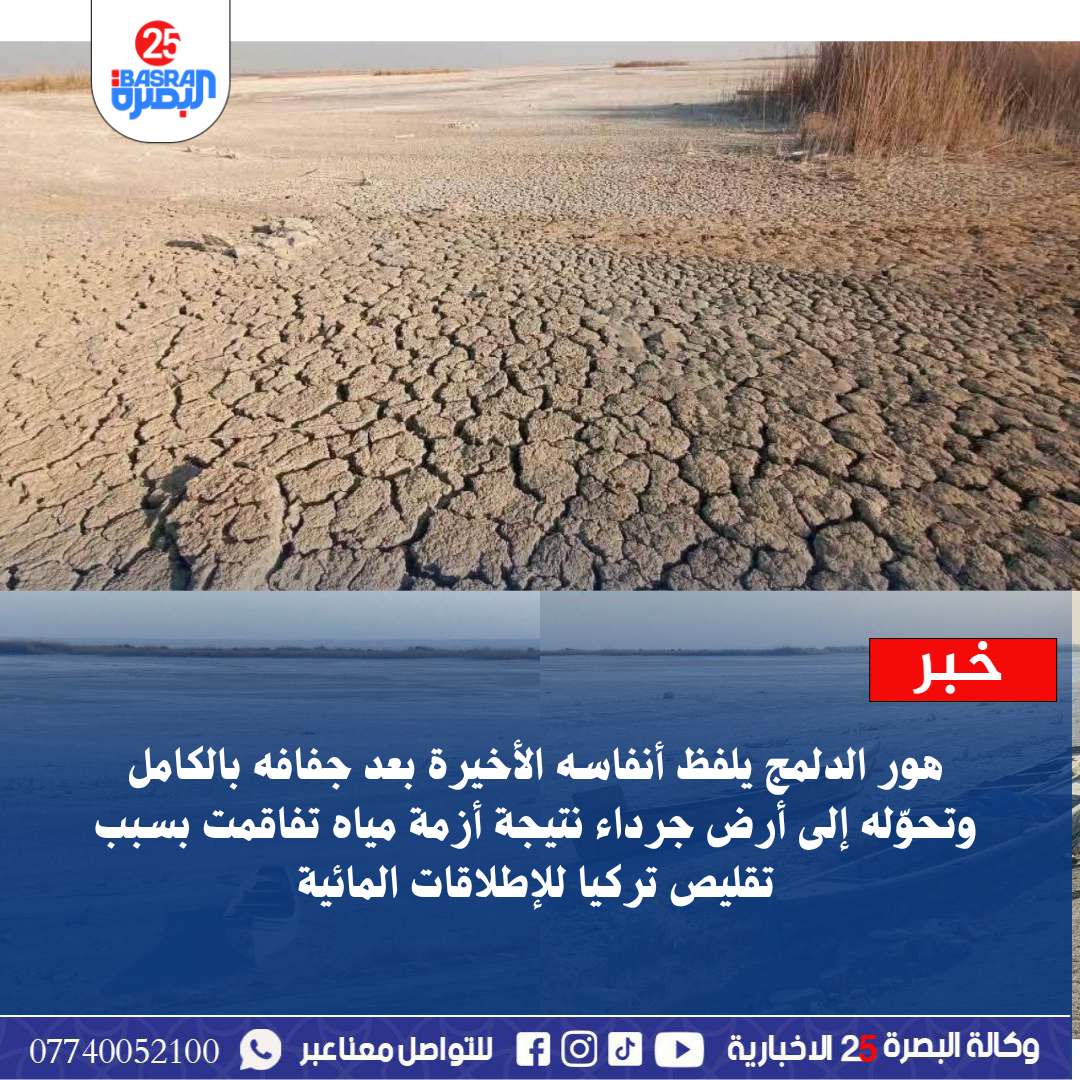 هور الدلمج يلفظ أنفاسه الأخيرة بعد جفافه بالكامل وتحوّله إلى أرض جرداء نتيجة أزمة مياه تفاقمت بسبب تقليص تركيا للإطلاقات المائية