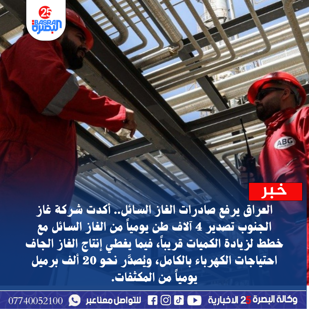 العراق يرفع صادرات الغاز السائل.. أكدت شركة غاز الجنوب تصدير 4 آلاف طن يومياً من الغاز السائل مع خطط لزيادة الكميات قريباً، فيما يغطي إنتاج الغاز الجاف احتياجات الكهرباء بالكامل، ويُصدَّر نحو 20 ألف برميل يومياً من المكثفات.