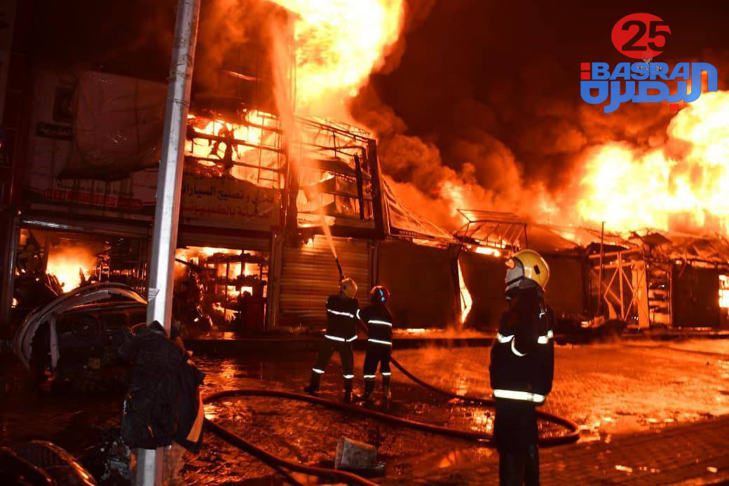 الدفاع المدني: نكافح حادث حريق كبير في عدد من المباني والمحال التجارية المتخذة لتصليح العجلات بمنطقة الطالبية شرقي بغداد